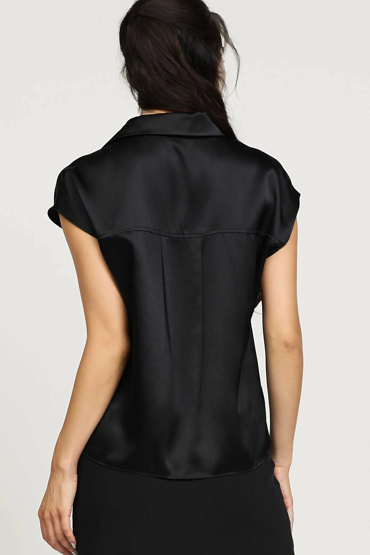Refined yet effortlessly chic, this silk cap-sleeve blouse is a wardrobe essential. Designed with a smooth, lustrous finish and a relaxed silhouette, it’s perfect for both polished office looks and elegant evening styling.