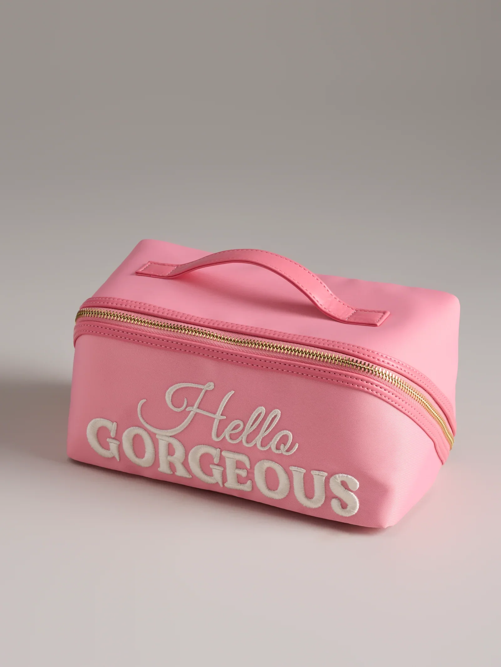 Say hello to your new favorite travel sidekick—the "Hello Gorgeous" Cosmetic Zip Pouch. This perfectly pink pouch is here to keep your beauty essentials stylishly stashed and easy to reach. Its roomy interior and sturdy shape make it ideal for everything from makeup brushes to skincare serums. Bonus: the diagonal zip closure opens wide and lays completely flat for effortless access.