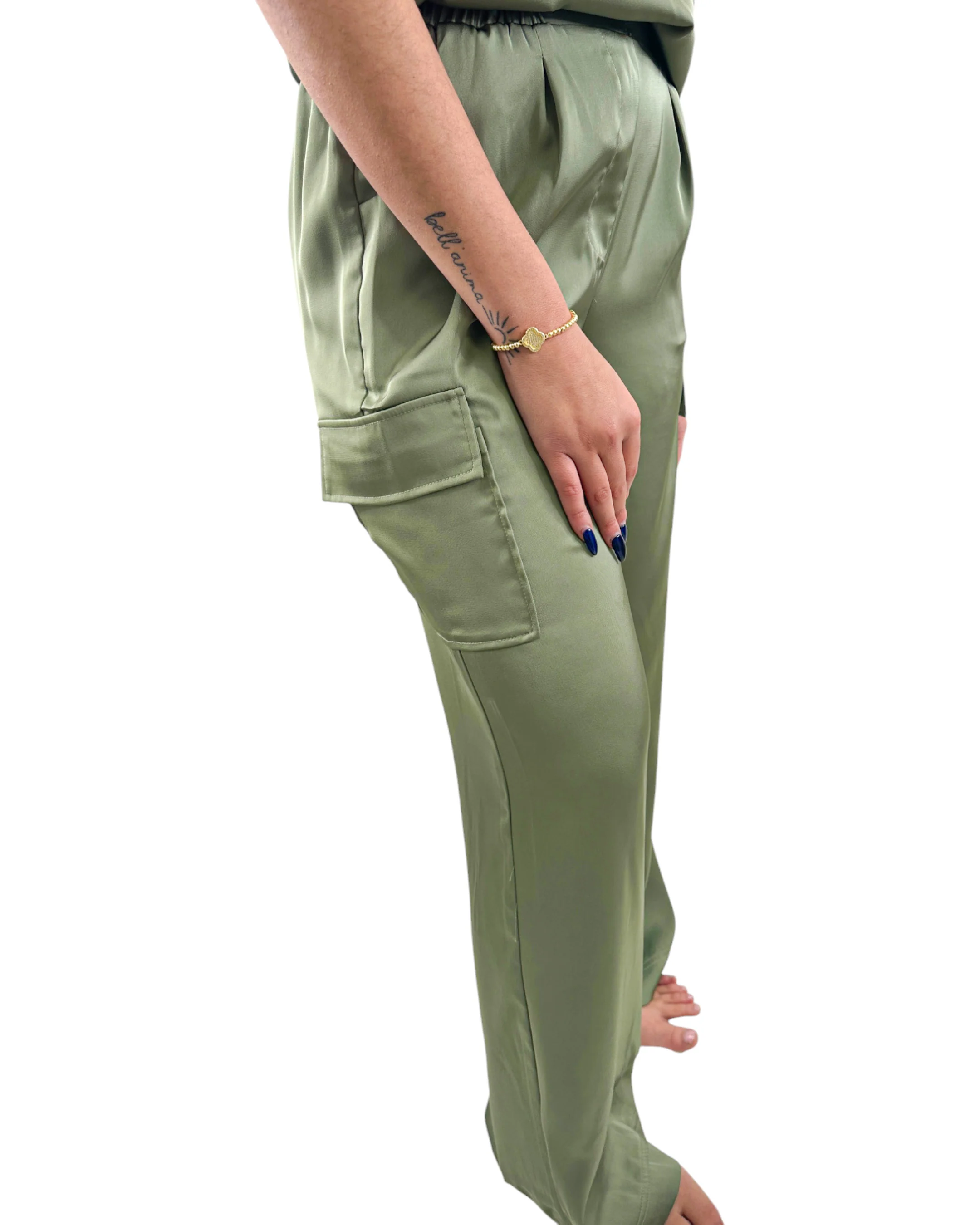 A contemporary take on cargo pants, blending luxe satin with a relaxed, tailored feel.